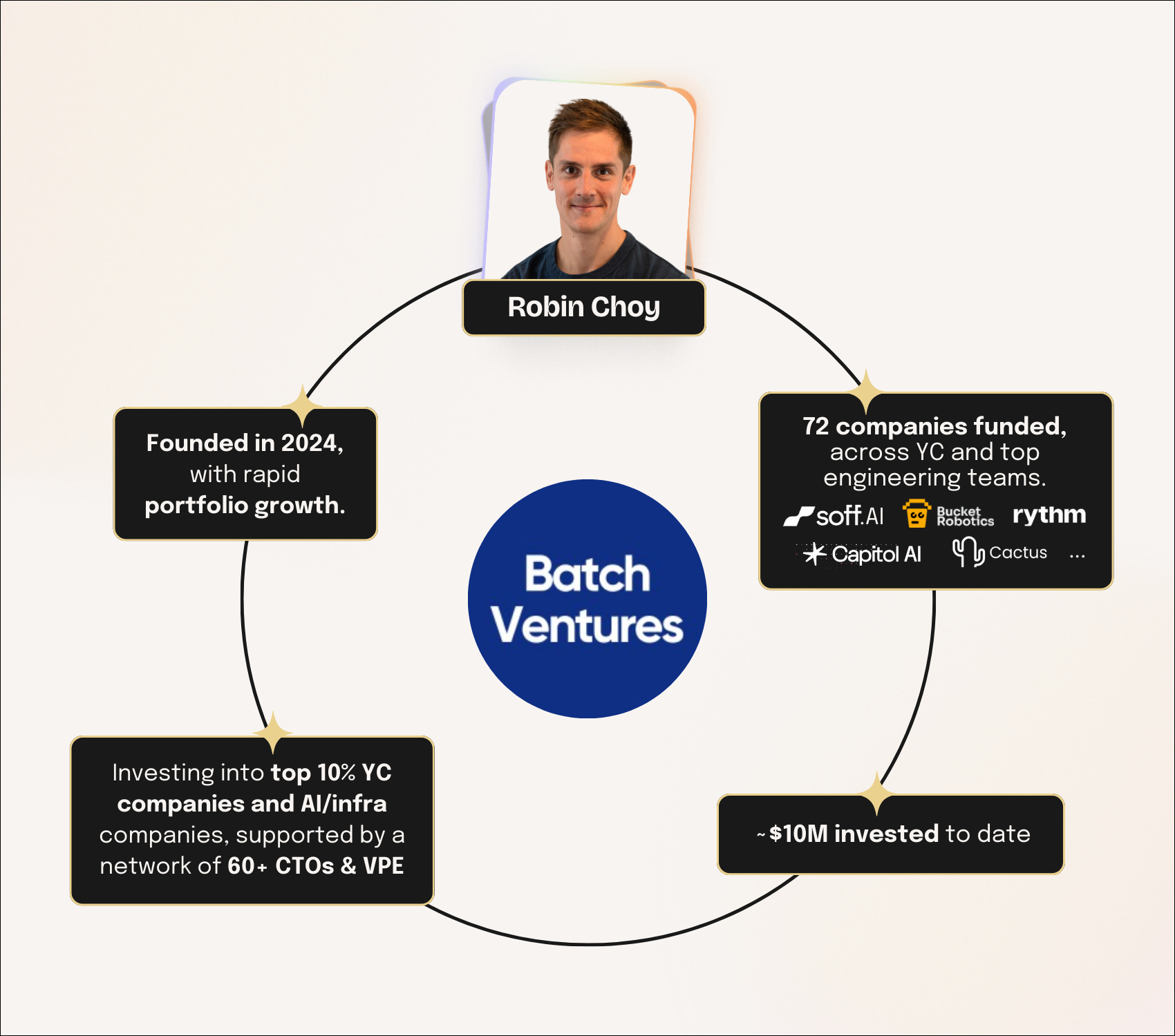 Founded in 2024 by Robin Choy, the mission of Batch Ventures is to reinvent venture capital by backing founders from the world’s best networks with speed, operational insight and product-obsessed support.