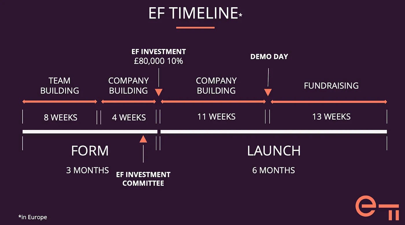 The process starts with EF’s Form phase: a 3-month sprint of workshops, founder matching, and validation sprints. Only 40% of participants reach EF’s investment committee, which then funds around 50% of those teams. This cadence forces founders to work at a pace rarely seen outside of Y Combinator.